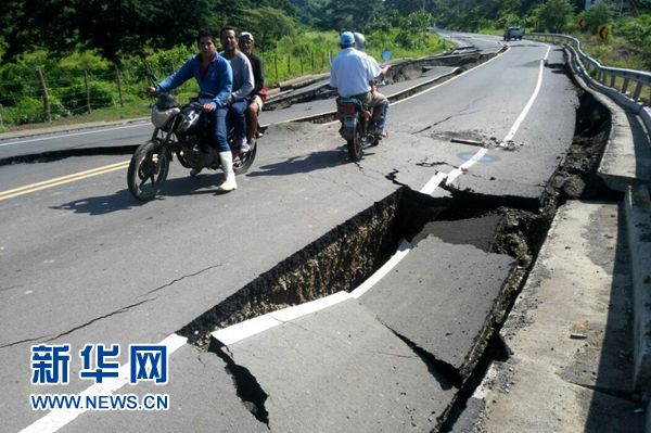 4月17日,在厄瓜多尔佩德纳莱斯市,当地人驾驶摩托车在被地震毁坏的公路上行驶。