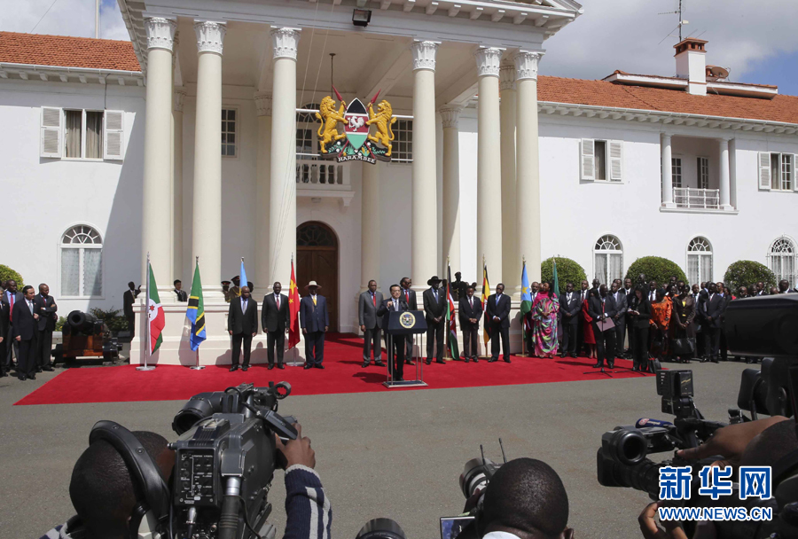 5月11日,中国国务院总理李克强在内罗毕国家宫与肯尼亚总统肯雅塔共同会见记者,介绍中非合作建设肯尼亚蒙巴萨-内罗毕铁路情况。乌干达总统穆塞韦尼、卢旺达总统卡加梅、南苏丹总统基尔等东非地区国家领导人参加。