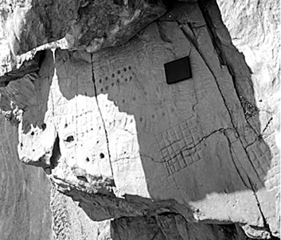 我们现在以具茨山的一幅岩画为例(图12),来区分一下不同图案的相互关系。这幅画面上刻凿着不同图案:圆形凹穴、方形深凹穴和方格棋盘形图案,我们可以根据相互间打破、叠压关系以及风蚀程度等,来辨识出它们之间的相对年代关系。画面中间的是两排分布不是很规范的凹穴,这些凹穴是用直接敲凿法制作而成,其风蚀程度最甚,有些凹穴被方格图案所打破;画面上部有两排分布规范的圆形凹穴,根据腐蚀程度和依然可以观察到的锋锐边缘来看,应为金属工具刻凿而成;围绕着这两种圆形凹穴的外围,分布有方格棋盘形和方形深凹穴图案,这两种图案均为金属工具刻凿而成。特别是方形深凹穴,直接敲凿法无法制作,只能使用刻凿方法制作。在这幅岩面上,我们根据打破关系可以确定位于中心部位的用直接敲凿法制作的圆形凹穴图案时代最早;而且从构图的情况来看,直接敲凿法制作的圆形凹穴也往往位于岩面的中心部位。无论是圆形或方形深凹穴,或方格棋盘形图案,凡是用金属刻凿的图案,则时代较晚。用金属刻凿的图案中,孰早孰晚,尚难确定:有些画面上方格棋盘形图案打破凹穴图案;而在有些岩面上则情况相反。