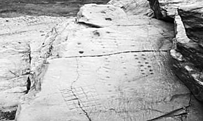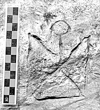 这类岩画在具茨山上仅发现一处,画面由3个人形、1个网格和6个凹穴图案组成。岩石北部有两个小人,每个小人的双腿分立,中间有一个菱形穴,剖面呈V字形。其中一个小人的东面是三个符号,经过辨识,有些学者认为是“入柙子”三个汉字,表示女人生孩子的意思。一个为平行四边形,深2厘米。在岩石西北部是一个男性小人。(图9)
