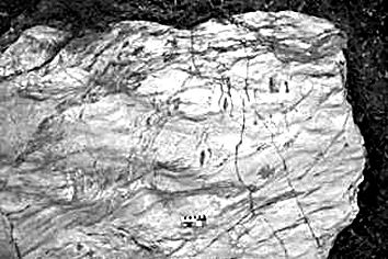 在具茨山岩画中,大部分沟槽往往与凹穴组合在一起,有些画面突出的是凹穴,而有些画面突出的则是沟槽。如图7是一块平面约250×165厘米的岩石,上面是一幅凹穴与沟槽组合图,但此画面中沟槽的表现非常突出,望之若河流。在有些沟槽的末端,刻凿着小型凹穴。(图7)