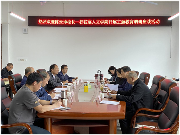 为扎实推进学习贯彻习近平新时代中国特色社会主义思想主题教育,把理论学习、调查研究、推动发展有机结合,整体推进,10月23日下午,安顺学院党委副书记、校长陈云坤,党委委员、副校长郭本华,党委委员、副校长殷红敏率宣传部、人事处、教务处、科研处、发规处、乡村振兴中心、旅游学院等相关部门、学院负责人到人文学院开展主题教育调研。调研重点就如何以新文科建设推进学校转型发展等内容进行面对面交流,听取一线教师意见建议。人文学院领导班子、高层次人才、科研教师代表、学生代表等参加座谈。