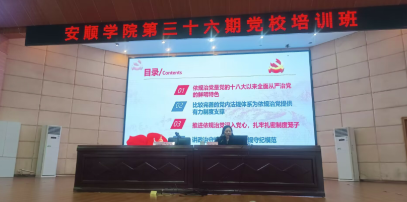 2023年11月15日,安顺学院党委委员、纪委书记、监察专员蔡红英以“增强依规治党意识 争做遵规守纪模范”为题为第36期党校培训班学员上党课。安顺学院党委委员、党委组织部部长何朝越主持党课。
