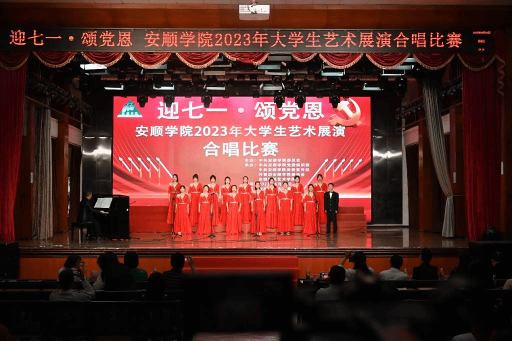 为庆祝建党102周年,进一步深化党史学习教育,表达对党的感激之情,弘扬红色文化,6月16日,由中共安顺学院委员会主办,安顺学院党委组织部、宣传部、团委和艺术学院承办的“迎七一·颂党恩”大学生艺术展演合唱比赛在大礼堂举办。