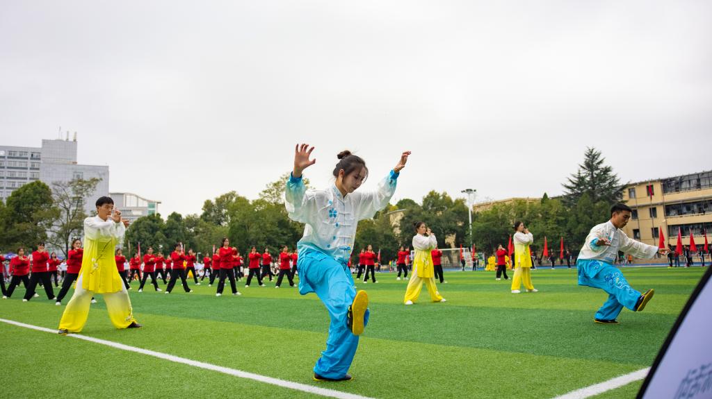 之后,广播体操队员们精神饱满,热情高涨,认真投入,用整齐划一的动作,端庄秀丽的姿态揭开精彩的文艺表演。在铿锵锣鼓声中,首蒙青巾,腰围战裙,戴脸子于额前,手执戈矛刀戟之属的展演者用急如瀑雨,畅若飞燕的身姿再现金戈铁马的征战故事,再现被誉为“中国戏剧活化石”的安顺地戏。充满活力的踏板操激情律动,健身气功《八段锦》集国术精华之集如锦缎般柔顺。舞龙表演《龙腾盛世》将文艺表演再次推向高潮。