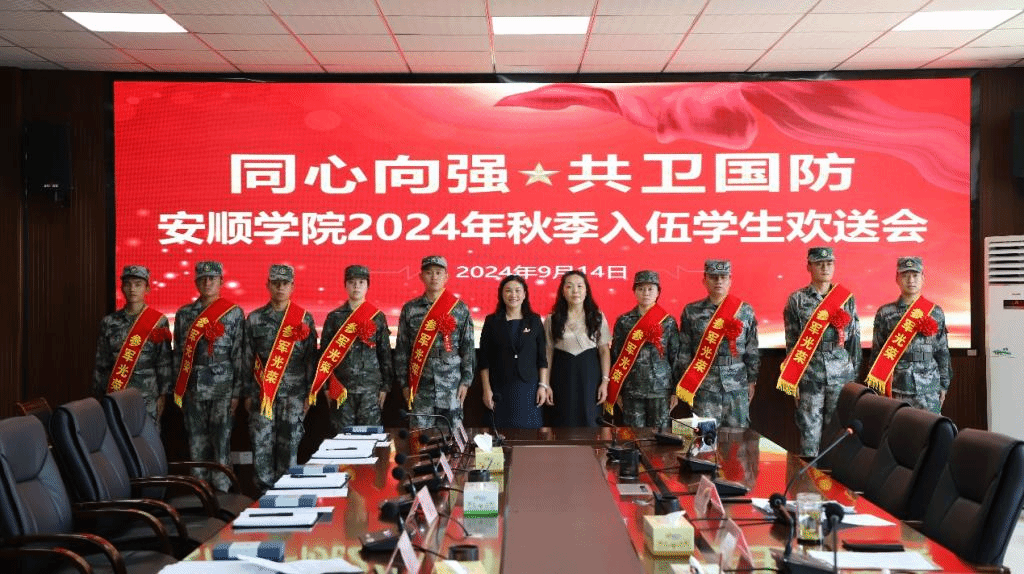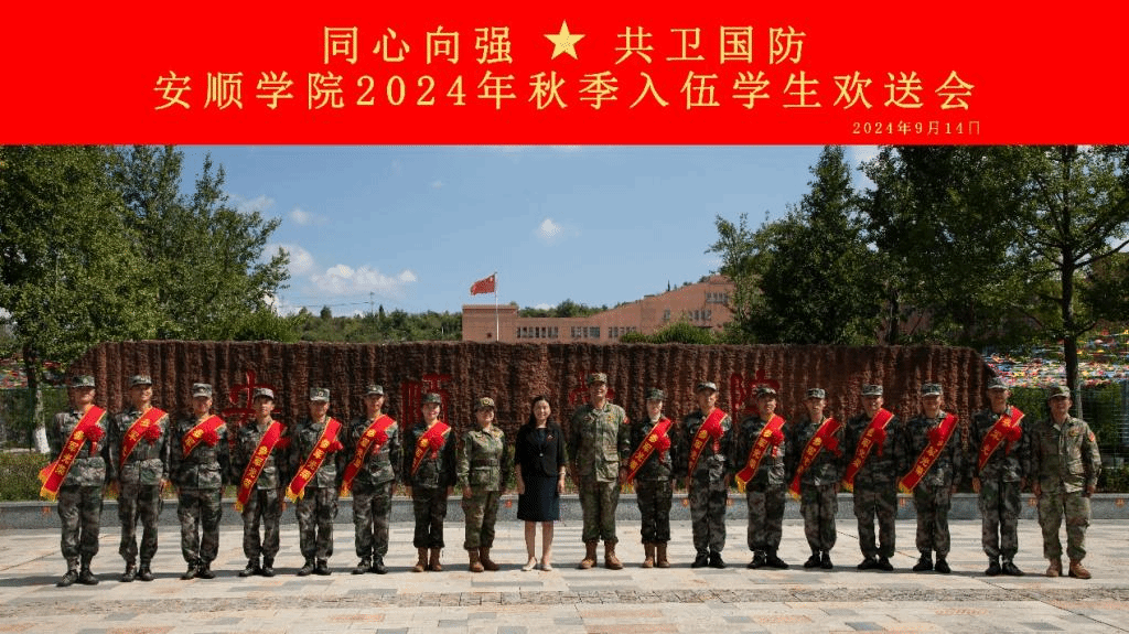 9月14日,安顺学院举行2024年下半年入伍新兵欢送仪式,为即将开启军旅新征程的优秀学子送行。党委书记罗荣彬书面向入伍学生表示祝贺、提出希望,校长曾丽,校党委委员、副校长殷红敏出席并讲话。入伍学生和武装部相关人员等参加欢送仪式。