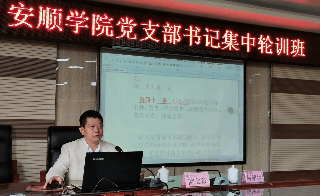 9月25日,安顺学院党支部书记集中轮训班在特教大楼七楼第一会议室开班。安顺学院党委副书记陶文彩、组织部部长何朝越进行了授课,安顺学院各党支部书记参加学习。