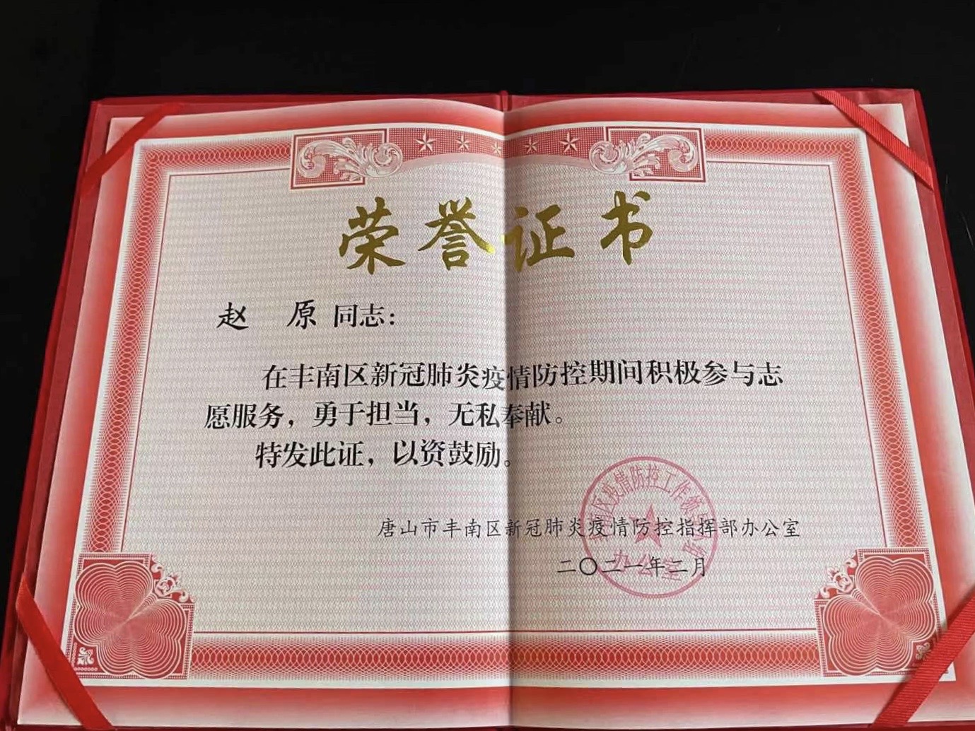 为了遏制新冠疫情在河北蔓延,共同战胜疫情,积极为家乡贡献一份力量,赵原返乡后,主动请缨志愿服务,勇担青春使命,助力疫情防控,积极投身于这场无硝烟的战争中,他于2021年1月4日至2月4日在河北省唐山市丰南区新冠肺炎疫情防控指挥部办公室参与志愿服务,主要负责新冠疫情的各类信息汇总、文件传递、材料整理等工作,他坚守志愿岗位,任劳任怨,除做好本办公室工作之外,还为一线战疫人员发放防疫物资等工作。