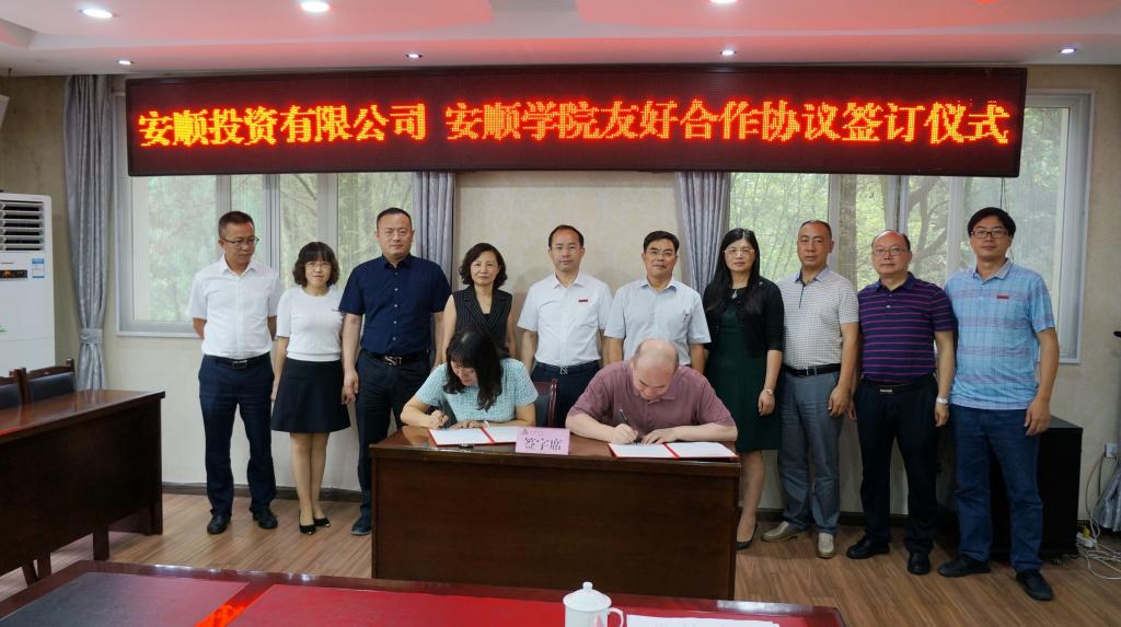 2018年7月4日,安顺学院与安顺投资有限公司友好合作协议签订仪式在行政办公楼二楼会议室举行。学院党委书记罗荣彬,院长刘雷,副院长王芳恒,安顺投资有限公司董事长李英,总经理罗丽萍,副董事长李家伟,董事长助理、人力资源部经理罗传英,安顺旅游投资公司副总经理朱海涛,安顺学院党政办主任兼经济与管理学院党总支书记韦英,发展规划处处长刘昌友,教务处处长李琳,教务处副处长郑海波及部分工作人员参加座谈。罗荣彬书记主持座谈并讲话。