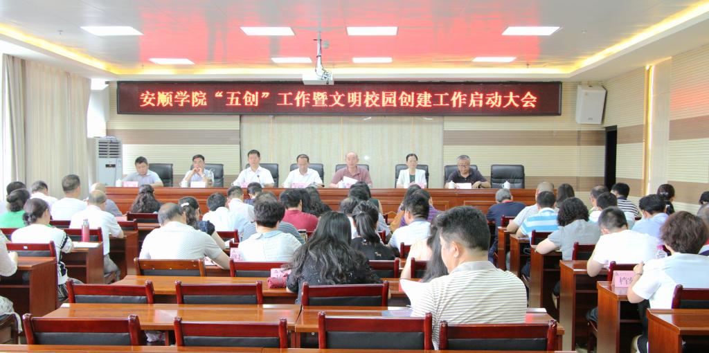 2018年7月4日下午,安顺学院“五创”工作暨文明校园创建工作启动大会在特教大楼七楼会议室召开。安顺学院党委书记罗荣彬,院长刘雷,党委副书记陶文彩,副院长熊国敏、王芳恒、令狐荣涛,纪委书记马力,全校正处级干部、主持工作的副处级干部以及宣传部(文明办)全体人员参加会议。会议由刘雷院长主持。