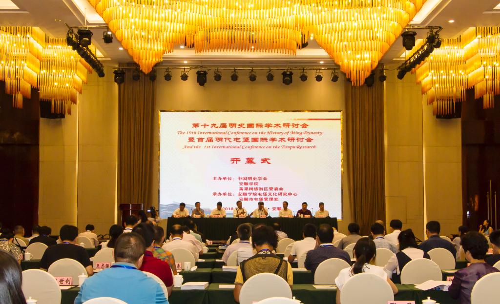 2018年8月16日上午,由中国明史学会、安顺学院、黄果树旅游区管委会联合主办,安顺学院屯堡文化研究中心、安顺市屯堡管理处承办的第十九届明史国际学术研讨会暨首届屯堡研究国际学术研讨会在安顺市万绿城铂瑞兹酒店隆重开幕。中国明史学会会长陈支平,中国明史学会首席顾问毛佩琦,安顺学院党委书记罗荣彬,安顺学院党委副书记陶文彩,安顺学院副院长王芳恒,黄果树旅游区工委委员、副主任曾琨,中国明史学会常务副会长高寿仙,中国明史学会副会长兼秘书长张宪博,中国明史学会副会长胡凡、阿风、张金奎,中国明史学会副秘书长彭勇、陈时龙,以及境内外屯堡文化研究专家学者百余人出席开幕式。开幕式由陶文彩副书记主持。