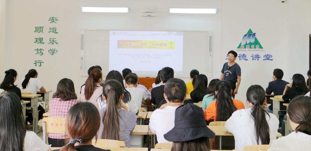 9月3日下午,安顺学院《“两个一百年”与“中国梦”》专题讲座在学校道德讲堂举行。安顺学院学习宣传贯彻党的十九大精神和习近平总书记在贵州省代表团重要讲话精神高校名师宣讲团成员、党委统战部部长、学生工作处(学生工作部、武装部)处(部)长蔡少平教授主讲。人文学院学生听讲。