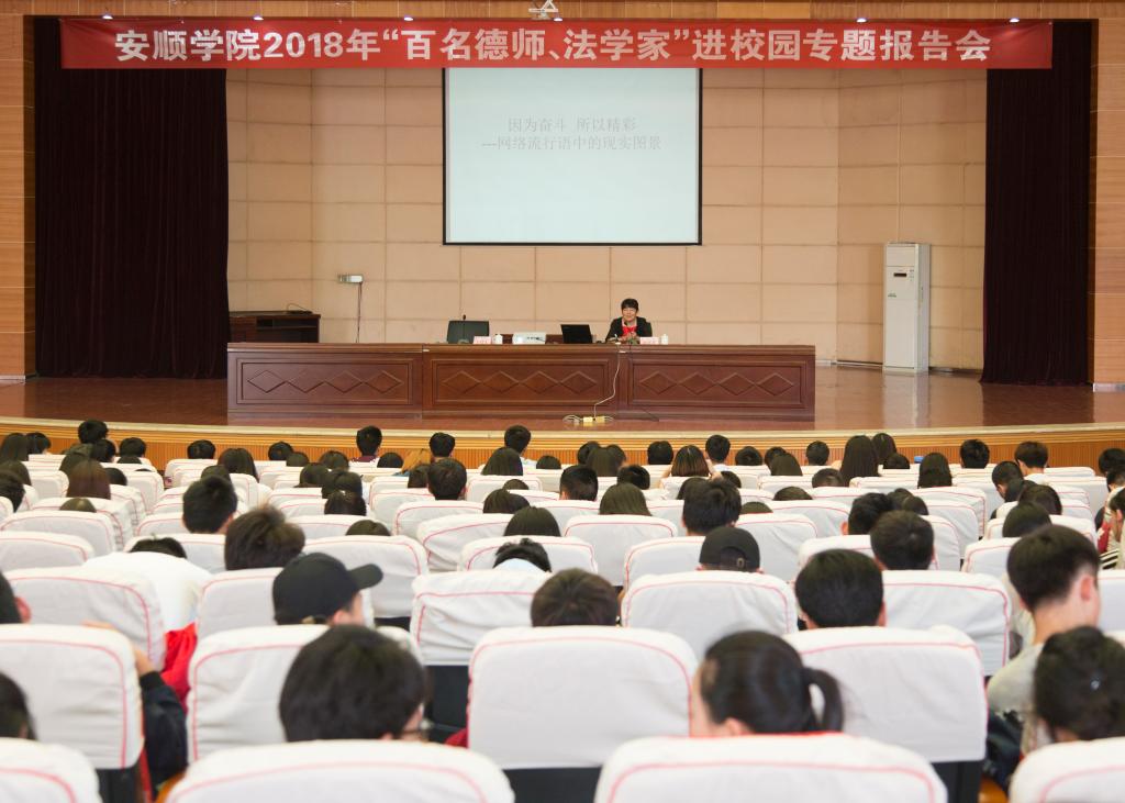 为贯彻落实中共贵州省委办公厅、贵州省政府办公厅印发的《关于进一步加强和改进新形势下全省高校宣传思想工作的实施意见》精神,贯彻省教育厅、省文明办、省民政厅、省司法厅、省法治宣传教育工作领导小组办公室下发了《关于开展“百名德师、法学家”进校园的通知》精神,我校开展了2018年上半年“百名德师、法学家”进校园活动。姚晓英主席《因为奋斗 所以精彩》专题报告会是该活动的其中一场。