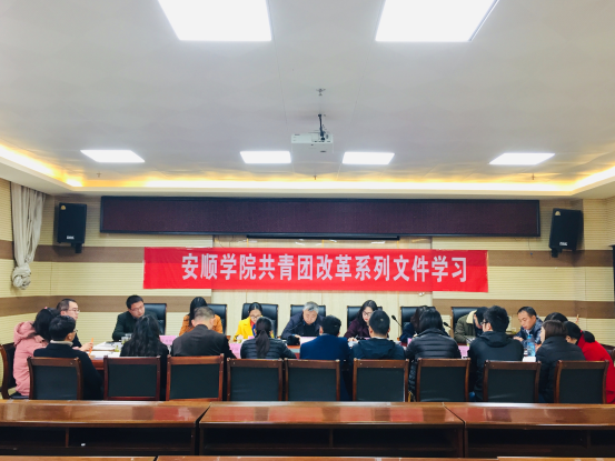 会议传达了《共青团中央改革方案》,学习了《中国共产主义青年团团旗、团徽、团歌制作使用管理规定》、《安顺学院共青团改革实施方案(试行)》、《安顺学院基层组织“三会两制一课“ 实施细则 (试行)》、《安顺学院基层组织工作条例 (试行)》、《安顺学院团组织生活管理条例》、《安顺学院团校管理章程》、《安顺学院发展团员工作细则》、《安顺学院共青团员推优入党实施办法》、《安顺学院第二课堂实施方案》等文件。