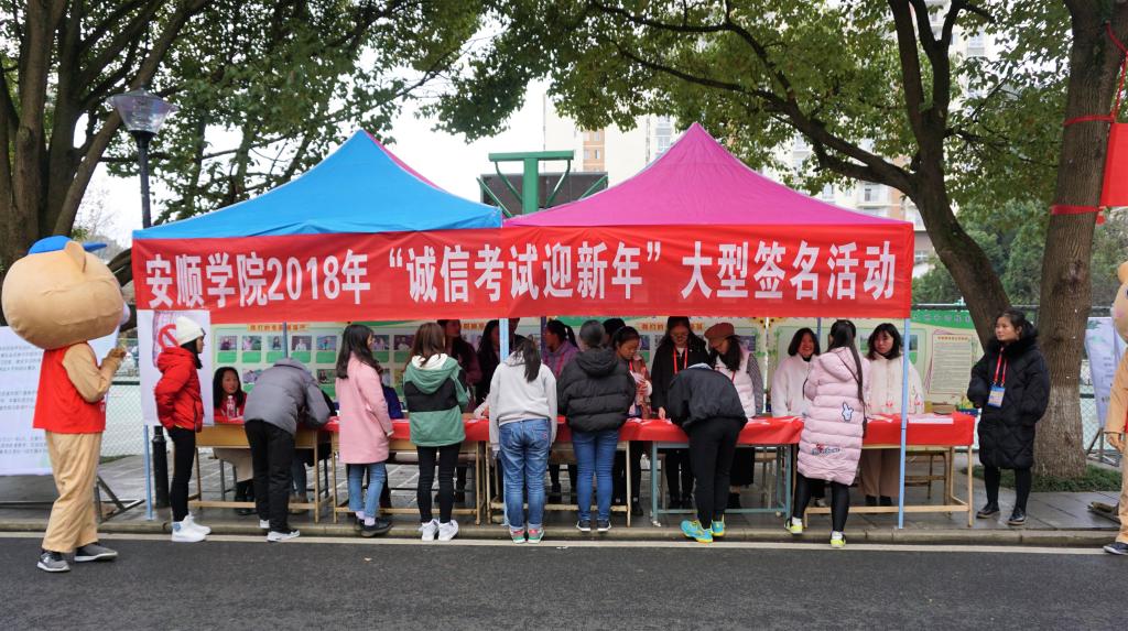 为引导同学们树立良好的学习风尚,严肃考试纪律,加强学风建设。12月11日至13日,由安顺学院主办,易班工作站、学风督察队、大学生记者团共同承办的2018年“诚信考试迎新年”大型签名活动在学校主干道举行。