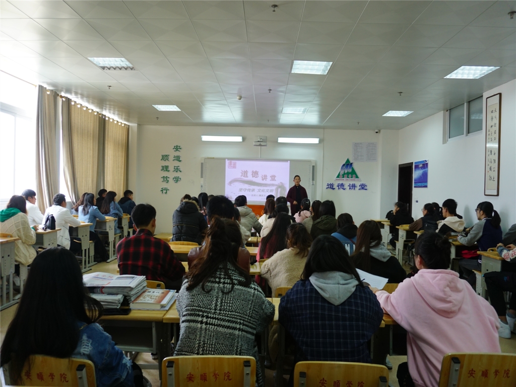 2019年3月4日下午,安顺学院“坚守传承中华优秀传统文化”专题讲座在学校道德讲堂举行。安顺地戏协会副会长潘发义主讲,人文学院同学聆听。
