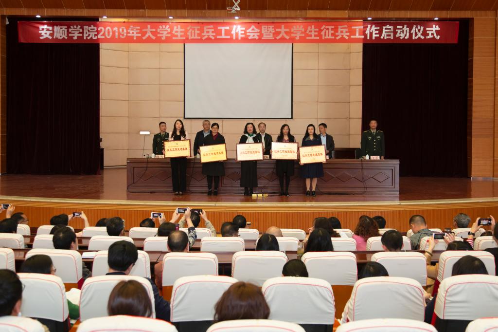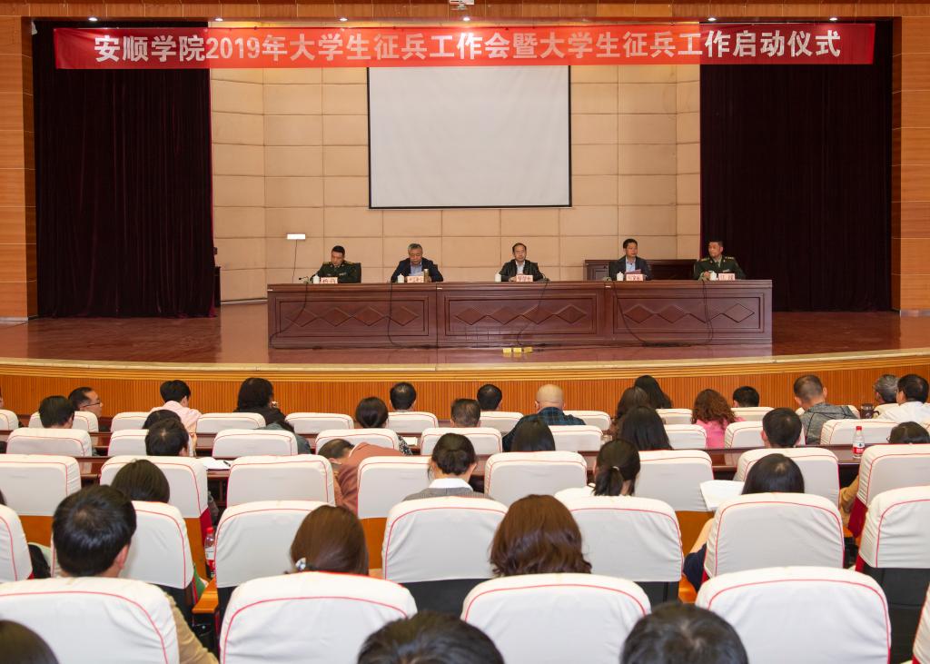 4月8日下午,安顺学院2019年大学生征兵会暨大学生征兵工作启动仪式在学术报告厅举行。安顺学院党委书记罗荣彬、党委副书记陶文彩、副校长令狐荣涛、安顺军分区动员处处长江波、西秀区人武部政委杨蓟出席会议。各二级学院党委书记、院长、副书记,学生科科长、副科长,全体辅导员、班主任;各职能部门主要负责人;学生处(学工部、武装部)、教务处、保卫处、资助管理中心全体同志参加会议。会议由副校长令狐荣涛主持。