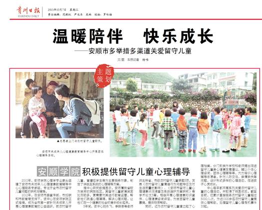 成立应用心理学服务团队,在“志愿中国网”组建安老师工作站志愿服务团体,实体依托与安顺市共建的安顺市未成年人心理健康教育辅导中心、安顺市爱心义工社,通过网络和实体两个平台积极开展教育教学改革,带领应用心理学志愿服务团队积极开展社会心理服务,尤其是农村留守儿童、困境儿童心理关爱,足迹遍及安顺市西秀区、紫云苗族布依族自治县、镇宁布依族苗族自治县、关岭布依族苗族自治县、务川仡佬族苗族自治县等地贫困民族山区,多渠道、多形式开展未成年人心理服务500余场,活动取得了良好地效果。学生的专业知识、专业技能、专业素养、职业素养不断提升。