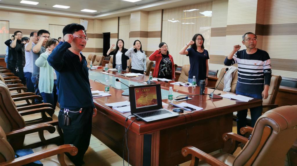 在鲜红的党旗下,在领誓人的带领下,与会党员重温了入党誓词,进行了庄严宣誓,对照誓词唤初心,对照标准找差距,进一步坚定理想信念,明确职责使命。