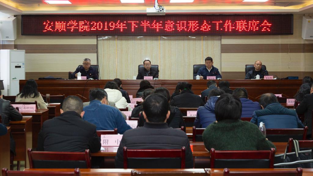 为认真贯彻落实党委(党组)意识形态工作责任制及中央和省委、省委教育工委、市委关于“不忘初心、牢记使命”主题教育的有关要求,进一步学习贯彻十九届四中全会精神。2019年12月19日,安顺学院2019年下半年意识形态专题工作会暨意识形态工作联席会在特教楼七楼会议室召开。党委书记罗荣彬、党委副书记陶文彩、副校长令狐荣涛、副校长郭本华出席,各职能部门主要负责人,各二级党委书记、院长参加会议。会议由陶文彩副书记主持。