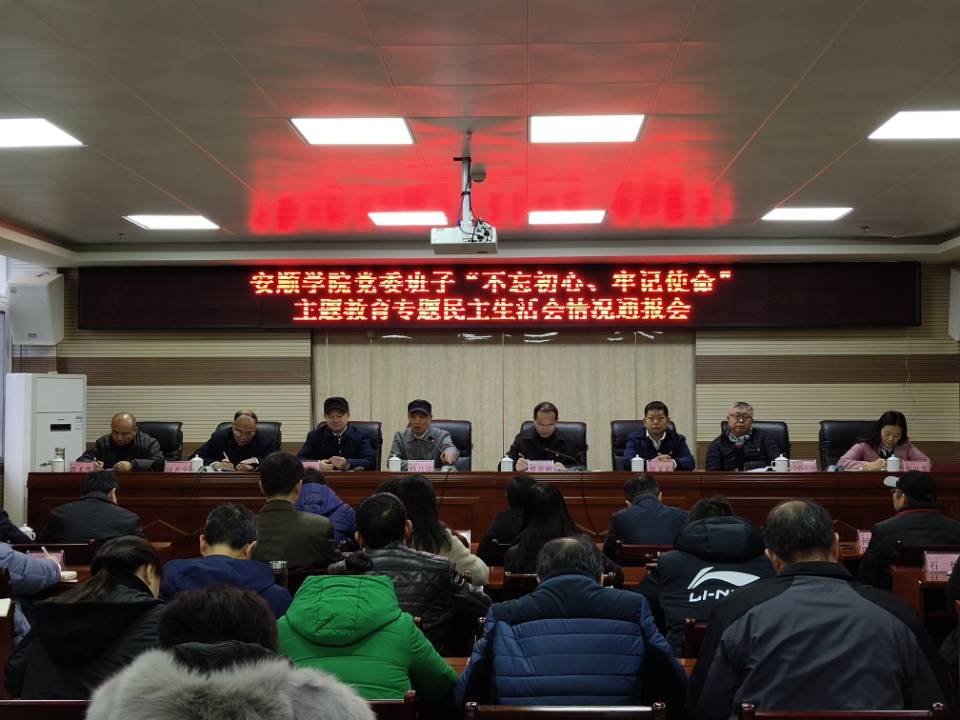 12月20日,安顺学院召开党委领导班子“不忘初心、牢记使命”主题教育专题民主生活会情况通报会,省委“不忘初心、牢记使命”主题教育第四巡回指导组副组长杨昌儒一行。安顺学院党委书记罗荣彬、校长吴次南、党委副书记陶文彩,副校长顾名宇、令狐荣涛、郭本华,纪委书记蔡红英及学校正处级干部、主持工作的副处级干部参加会议。会议由罗荣彬主持。