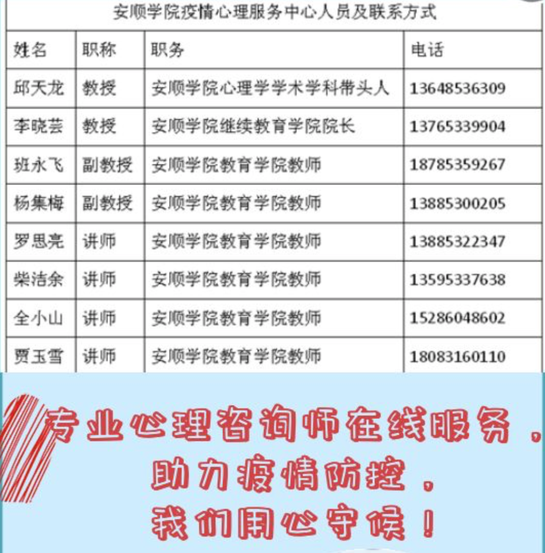 为共战疫情,做好防控疫情的社会心理服务工作,向防控一线及大众提供心理支持、心理疏导等服务,预防与减轻疫情所致的心理困顿,防范心理压力引发的极端事件。安顺学院教育学院充分发挥心理学学科专业服务社会功能,积极响应党中央国务院号召。经请示学校领导,同意学院成立了“安顺学院抗击疫情心理服务中心”,积极开展社会心理服务。全院心理学相关专业教师、二级心理咨询师积极踊跃报名、纷纷请战,党员干部和教师积极带头,组织开展了疫情应对心理援助微信宣传,开通手机专线,开展专业心理服务。教师们纷纷表示要为守护一线医务人员和大众的心理健康,为打赢疫情防控的总体战贡献一份自己的力量。(文:教育学院 蔡林 师文慧)