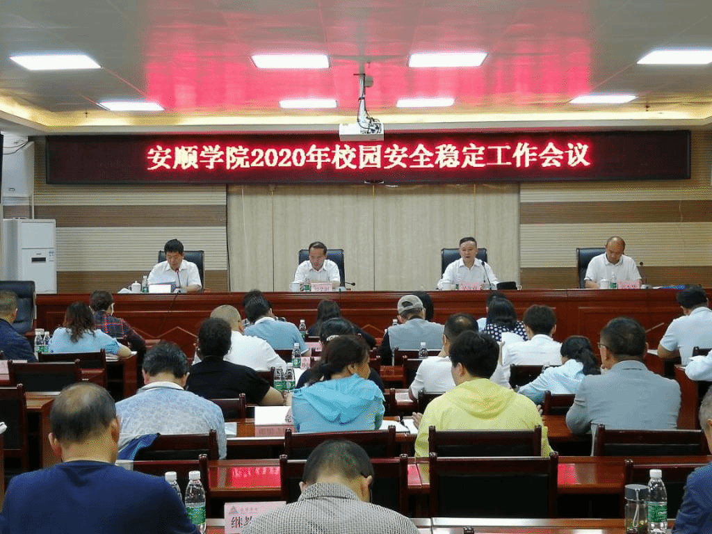 2020年6月19日上午,安顺学院2020年校园安全稳定工作会在特教楼七楼会议室召开。安顺学院党委书记罗荣彬、校长吴次南、党委副书记陶文彩、副校长郭本华出席会议,各二级学院书记、院长,各部门主要负责人、保安公司负责人等参加会议。会议由郭本华主持。