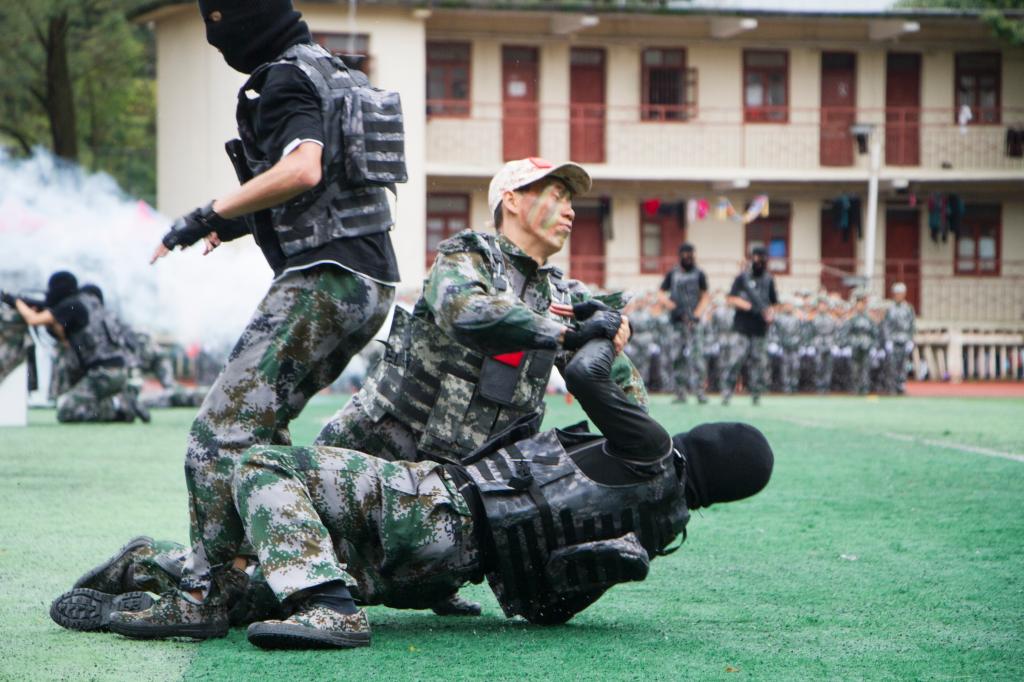 女子匕首操,她们动作整利落,昂首挺胸,手中紧握匕首。“杀!杀!杀……”,她们洪亮的声音响彻整个受训场,展现了巾帼不让须眉的气魄,给军训汇报增添了一抹亮色。