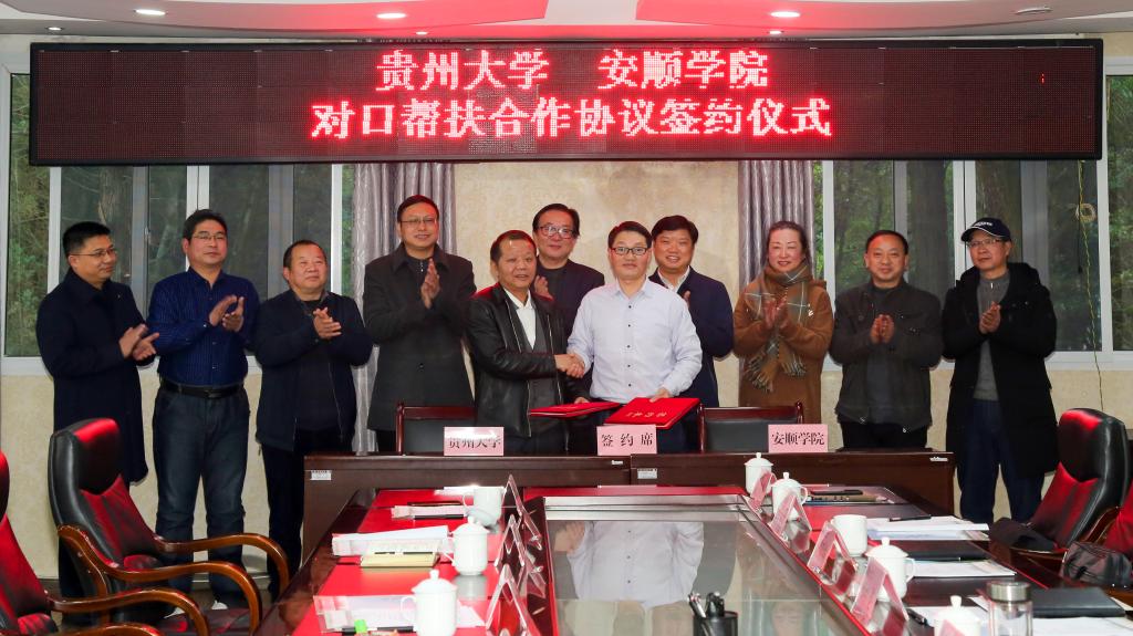 2020年12月28日下午,贵州大学与安顺学院对口合作协议签约仪式在安顺学院行政楼二楼会议室举行。贵州大学党委书记李建军、副校长李军旗;安顺学院校长陈云坤、党委副书记陶文彩,纪委书记、监察专员蔡红英,副校长张来出席签约仪式。签约仪式由陶文彩副书记主持。