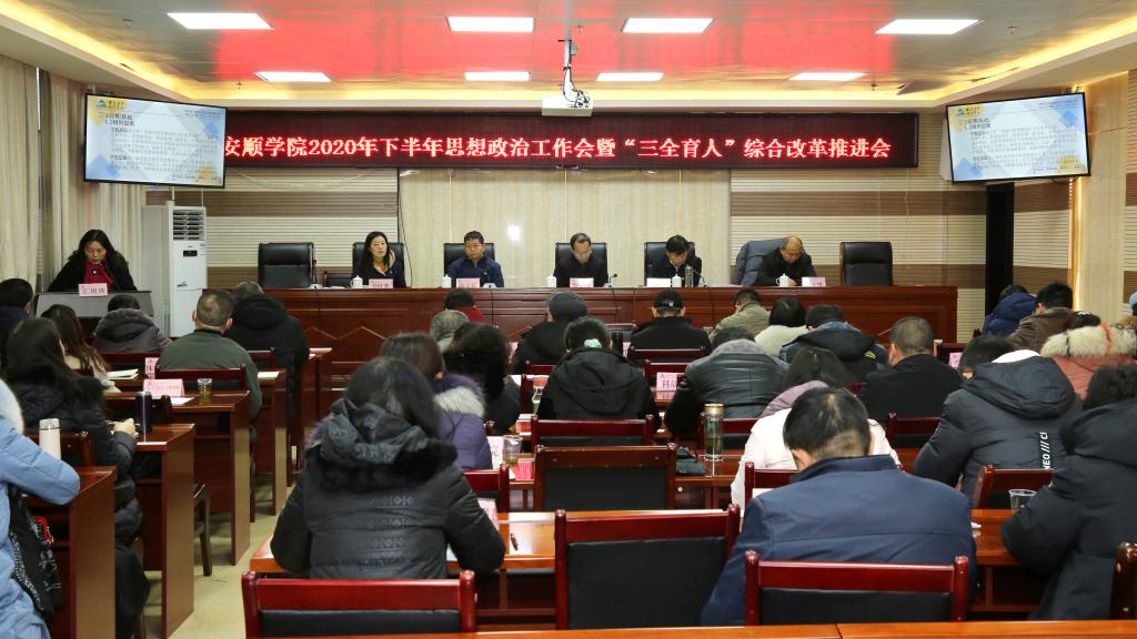 2020年12月30日上午,安顺学院召开2020年下半年思想政治工作会暨“三全育人”综合改革推进会,坚持为党育人、为国育才的初心使命,落实立德树人的根本任务,进一步对照中共中央、国务院《关于加强和改进新形势下高校思想政治工作的意见》提出的坚持全员全过程全方位育人(简称“三全育人”)的要求,总结前一阶段进展、部署下一阶段工作,形成共识,为“十四五”期间构建有安顺学院特色的思想政治工作体系、形成更高水平的人才培养体系奠定坚实基础。