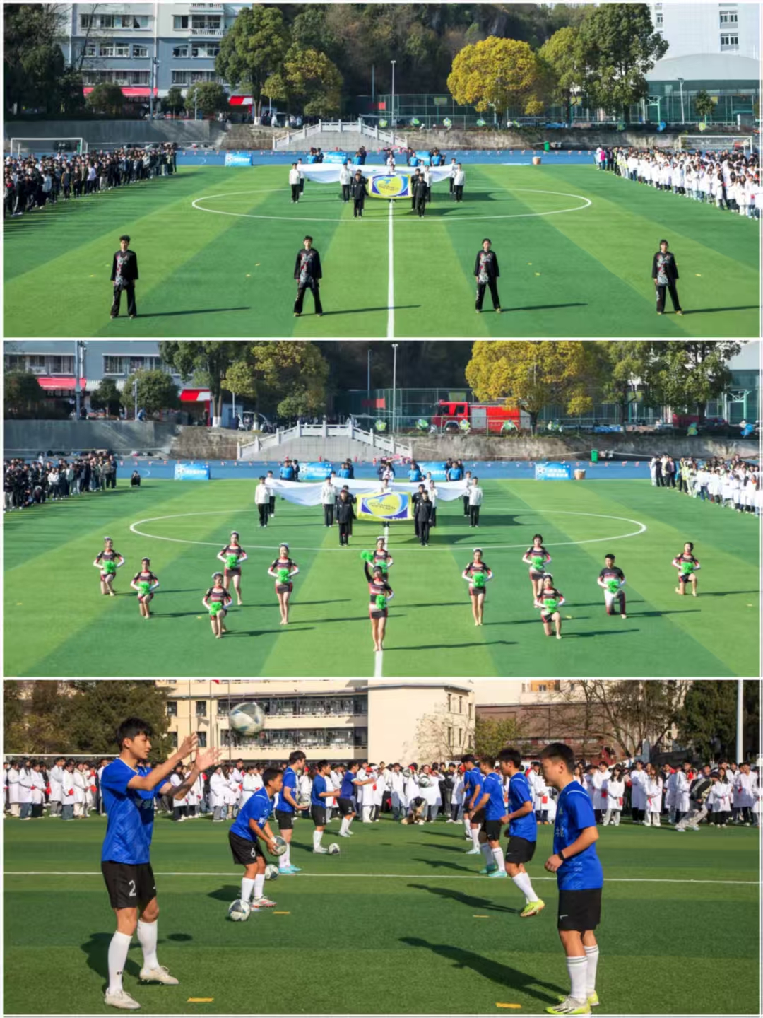 健身气功表演、啦啦操表演、足球技能展示现场
