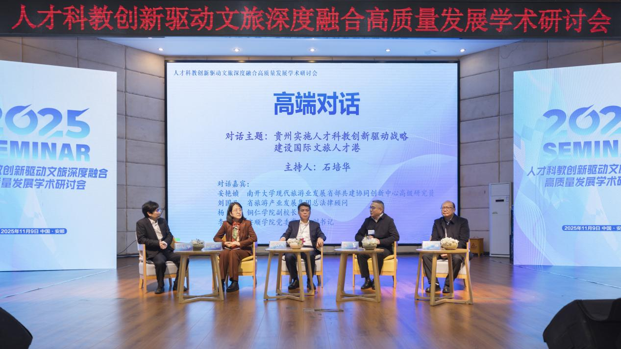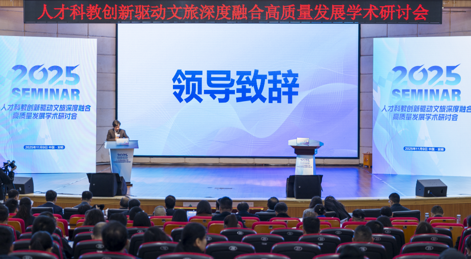 2025年11月9日上午,人才科教创新驱动文旅深度融合高质量发展学术研讨会在安顺学院举办。本次研讨会在贵州省教育厅、南开大学现代旅游业发展省部共建协同创新中心的指导下,由贵州省2023年度哲学社会科学规划重大课题“贵州推进文化和旅游深度融合发展研究”课题组、安顺学院、贵州旅游产业发展集团联合主办。来自教育界、学界、企业界等有关领域近100人参加研讨会。本次研讨会通过主旨发言、报告发布、高端对话等形式,围绕人才科教创新驱动文旅深度融合高质量发展的主题开展交流与研讨,积极响应国家推动文旅深度融合发展的战略部署,服务贵州打造世界级旅游目的地的建设目标,为贵州文旅产业的高质量发展注入智慧力量。