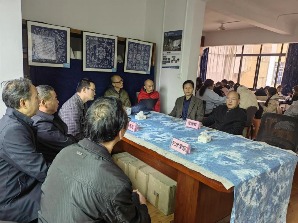 座谈会上,艺术学院有关负责人作关于蜡染实习基地建设、课程体系搭建及产学研合作的工作汇报。程绪权强调,一是要强化基地育人功能,将蜡染技艺教学与思政教育有机结合,引导学生树立文化自信,主动担当非遗传承使命;二是要推动创新转化,鼓励师生挖掘蜡染文化价值,探索与现代生活、文创产业的结合点,提升传统工艺的时代生命力;三是要深化校地协同,加强与地方非遗传承人、文创企业的合作,为学生搭建更广阔的实践平台,培养既懂技艺又懂市场的复合型人才;四是建议艺术学院撰写方案,通过“引企入校”将蜡染企业引入校内并进行生产,同时成立蜡染文化艺术研究院,牵头深化非遗蜡染的学术研究与实践探索。
