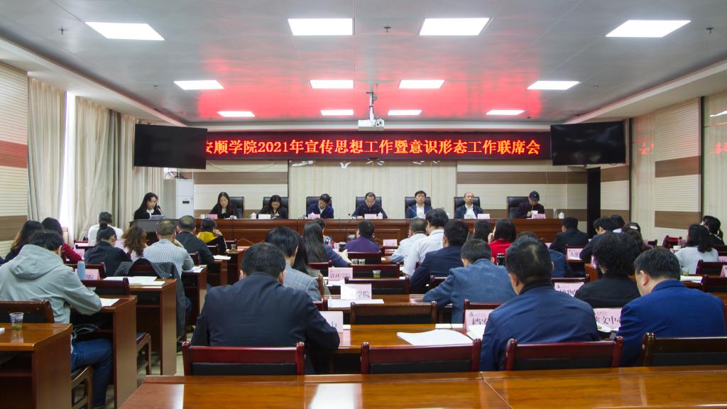 5月28日,安顺学院2021年宣传思想工作暨意识形态工作联席会在特教大楼七楼会议室召开。安顺学院党委书记罗荣彬、校长陈云坤、副书记陶文彩、副院长郭本华、纪委委员蔡红英,党委委员、组织部部长何朝越,党委委员、宣传部部长殷红敏,各职能部门主要负责人,各二级党委书记、院长参加会议。会议由校长陈云坤主持。