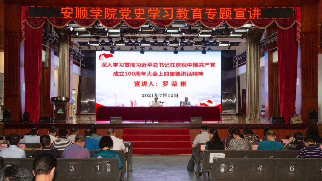 为深入学习贯彻习近平总书记在庆祝中国共产党成立100周年大会上的重要讲话精神和进一步推进党史学习教育,7月12日,安顺学院党委书记罗荣彬同志围绕习近平总书记“七一”重要讲话精神,为全校党员干部和教职工开展了一次详实生动的党史学习教育专题宣讲报告。安顺学院全体党员干部和教职工代表共600余人认真聆听了宣讲。