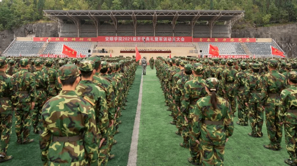 2021年10月9日上午,安顺学院2021级新生开学典礼暨军训动员大会在足球场隆重举行。安顺学院党委书记罗荣彬,党委副书记、学生军训团临时党委书记、政委陶文彩,党委委员、副校长郭本华,党委委员、纪委书记、监察专员蔡红英以及2021级学生军训团团部主要干部和各二级党委书记和院长,全体军训学员与新生班主任参加大会。大会分为两个阶段进行,开学典礼由罗荣彬主持,军训动员大会由陶文彩主持。