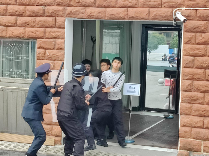 本次演练共分为两个环节。一是由学校护校队员进行警棍盾牌操汇报表演和防暴队型的变换,主要展示劈击弹踢、拨盖挑击、扫崩挑击、扫盖劈颈、戳踹劈头、扫腿崩击、架踢劈击、扫蹬戳胸、拨崩击肋、抡扫摔击等10个动作及94-8型防爆盾牌的使用;二是模拟遇袭处置汇报表演,主要模拟由学校三名保安队员扮演的“暴恐分子”,以看望学生为由,想方设法进入校园,在门卫的询问下,暴露了身份,然后强行闯入校园,学校其他保安看到此情况,立即向学校报告,并手持防暴器械进行阻拦,同时立即启动了《安顺学院反恐防暴应急预案》。经过大家的协同作战,成功将“暴恐分子”制服。