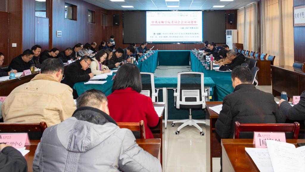 会议集中学习了全面深化改革委员会第二十三次会议精神、习近平总书记在全国党内法规工作会议上作出的重要指示精神、习近平在中央政治局第三十五次集体学习时的讲话,中央经济工作会议精神、省委经济工作会议精神,省委民族工作会议精神,市委党史学习教育巡回指导工作推进调度会精神,2021年全省高校党委书记抓党建工作述职评议、全省高校党的建设暨“五级书记抓党建”工作会议精神。书面传达学习了习近平在中国文联十一大、中国作协十大开幕会上的讲话,《中共贵州省委关于认真学习宣传贯彻党的十九届六中全会精神的决定》,全省教育系统学习宣传贯彻党的十九届六中全会精神和省委十二届十次全会精神宣讲会精神、省委人才工作会议精神、市委人才工作会议精神,中国共产党安顺市第四届委员会第十二次全体会议公报。