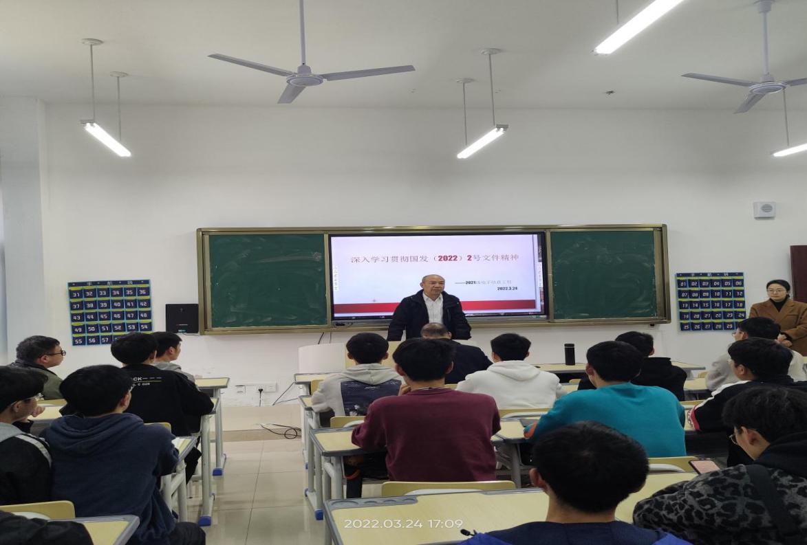 班会上,郭本华副校长为广大同学解读了新国发2号文件下发的历史背景和意义,针对电子信息工程专业的特点,为同学们如何利用好新国发2号文件指明了方向。希望同学们要立“报国之志”,厚植“家国情怀”,投身到复兴大业中去,抓住重大机遇努力学习,在贯彻落实新国发2号文件上贡献青年大学生的智慧和力量。(文/图:电信学院 张忠政/陈琳琳)