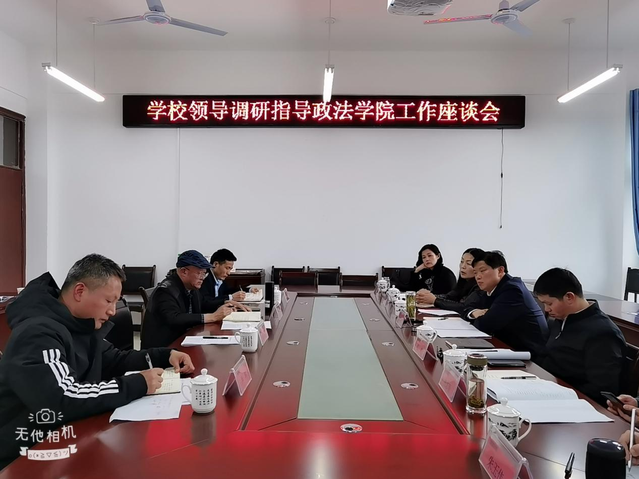 4月15日下午,安顺学院党委副书记、校长陈云坤,党委委员、副校长殷红敏,副校长张来,党委委员、统战部部长、教务处处长杜志明,招就处处长蒋晓昀,发规处副处长朱玉伟一行到政法学院调研指导并座谈。政法学院书记潘昌盛、院长徐忠、全体教研室主任和部分教师代表参加了座谈会,会议由陈云坤主持。