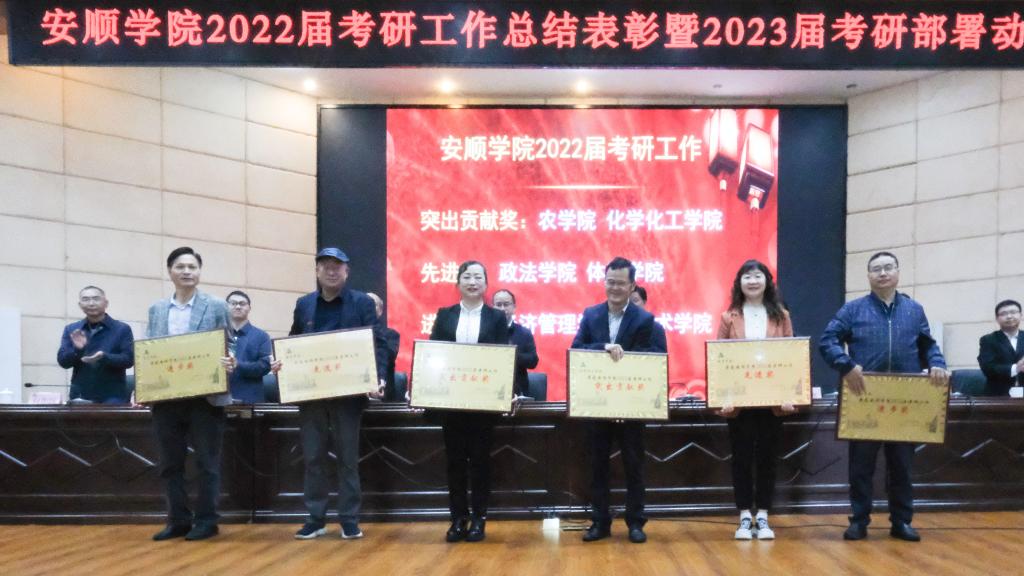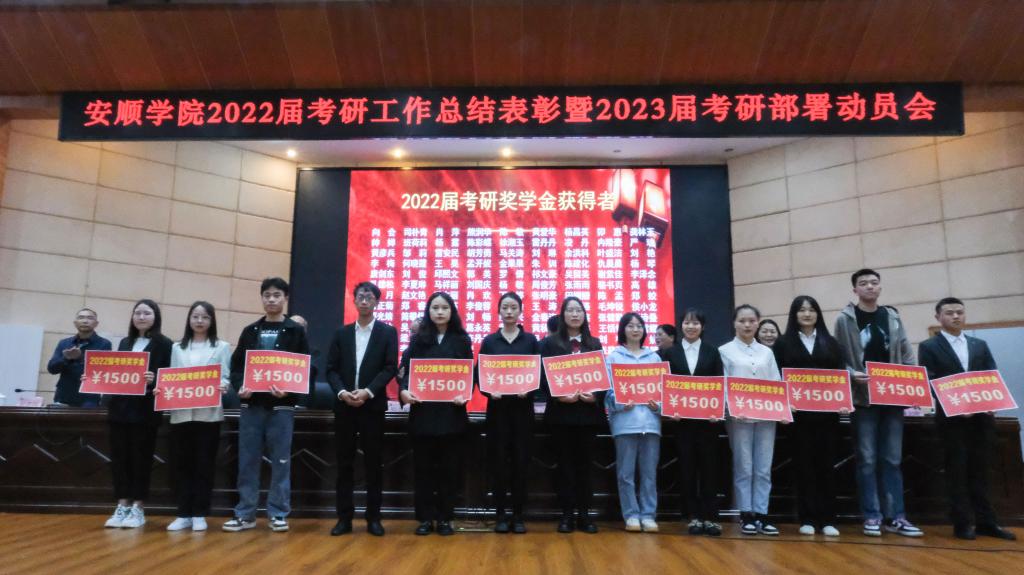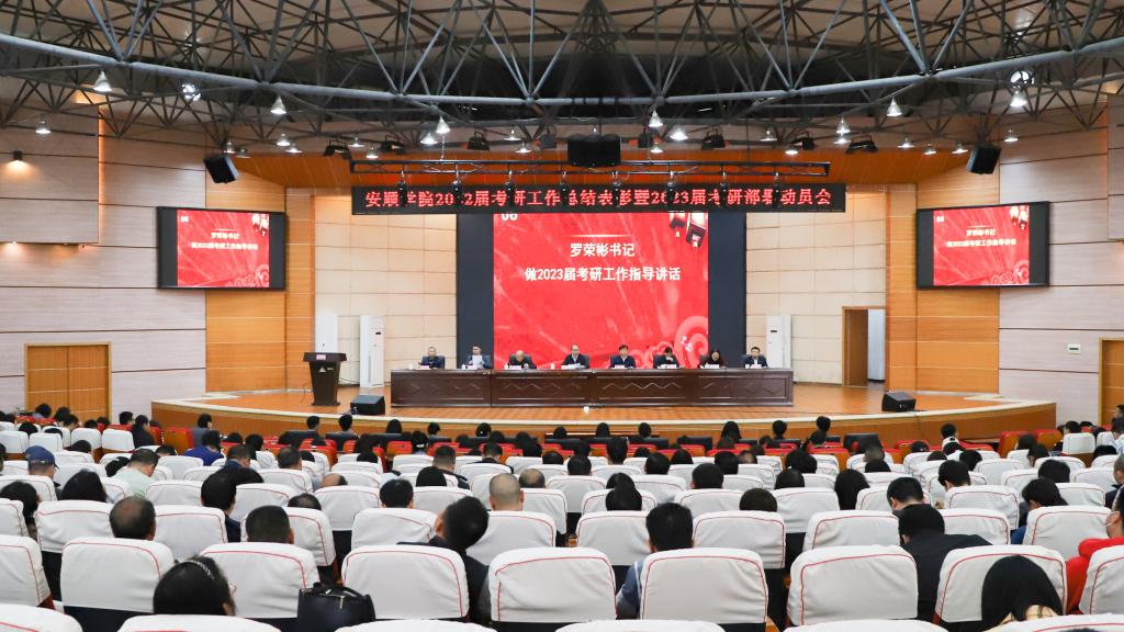 2022年5月26日上午,安顺学院2022届考研工作总结表彰暨2023届考研部署动员会在学术报告厅举行。安顺学院党委书记罗荣彬、校长陈云坤,党委副书记陶文彩,副校长郭本华、韦英、张来、殷红敏,党委委员何朝越、杜志明出席会议。各二级学院副处级以上干部、各职能部门负责人、2018级和2019级全体班主任、2018级拟录取的研究生代表、各学院2019级考研学生代表参加会议。安顺学院副校长张来主持会议。
