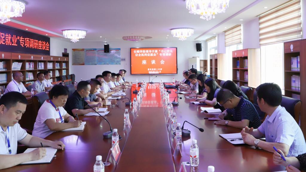 为贯彻落实教育部及省教育厅关于开展高校书记校长访企拓岗促就业专项行动要求,推进我校毕业生多维度、高质量就业,进一步优化我校人才培养方案,2022年7月1日,安顺学院党委委员、纪委书记 监察专员蔡红英,党委委员、副校长殷红敏,党委委员、统战部部长、教务处处长杜志明带队到普定县开展专项调研,实地考察普定县第二中学、第三中学,并召开座谈会。普定县委常委、副县长王泽勇出席座谈会,普定县教育和科技局党委委员、副局长田庆益主持会议。