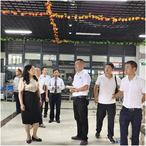 芳华苑食堂经理彭海明(右三)汇报食堂各项工作情况