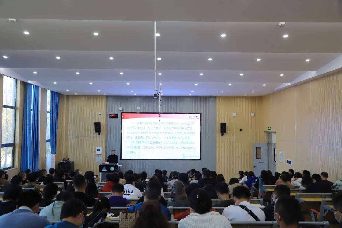 龚元洪围绕标本采集人员的个人防护、新冠病毒标本的采集、标本的包装、保存和送检、相关注意事项等方面为参训人员进行了培训。(文/图:教师工作处 王娴/学生记者 何春阳)