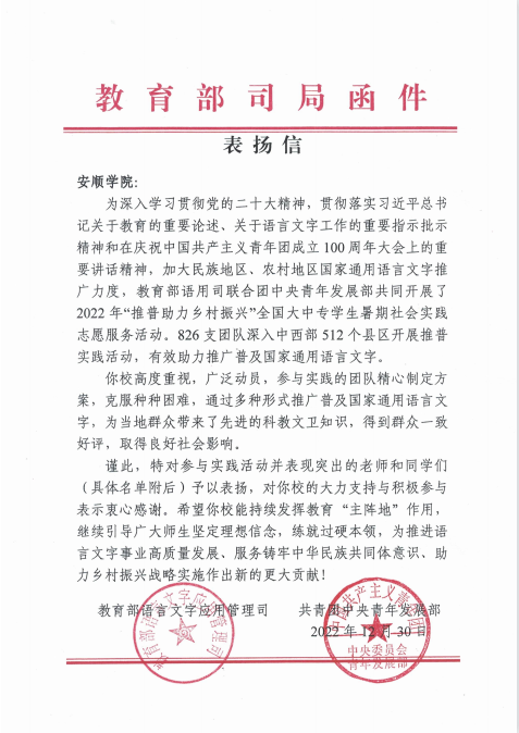 教育部语言文字应用管理司、共青团中央青年发展部致安顺学院表扬信