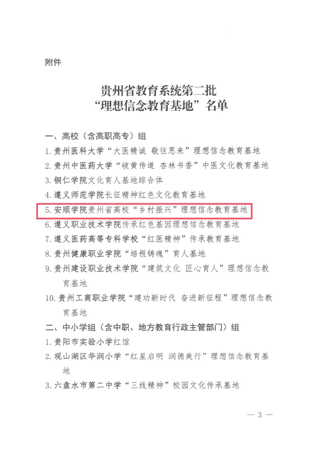 根据《省委教育工委省教育厅关于开展贵州省教育系统第二批“理想信念教育基地”申报遴选工作的通知》要求,按照公平、公正、公开的原则,省委教育工委、省教育厅组织专家对全省教育系统第二批“理想信念教育基地”进行了评审,安顺学院贵州省高校“乡村振兴”理想信念教育基地成功入选贵州省教育系统第二批“理想信念教育基地”。