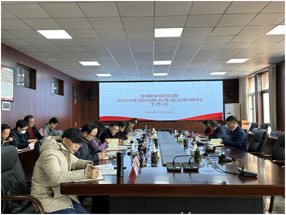 为常态化做好政治生态分析研判工作,12月12日下午,安顺学院党委2023年党内政治生态分析研判工作会在安道楼五楼会议室召开。安顺学院党委书记罗荣彬、党委副书记陶文彩出席会议,学校党内政治生态分析研判机制成员单位及相关部门主要负责同志参会。会议由党委委员、纪委书记、监察专员蔡红英主持。