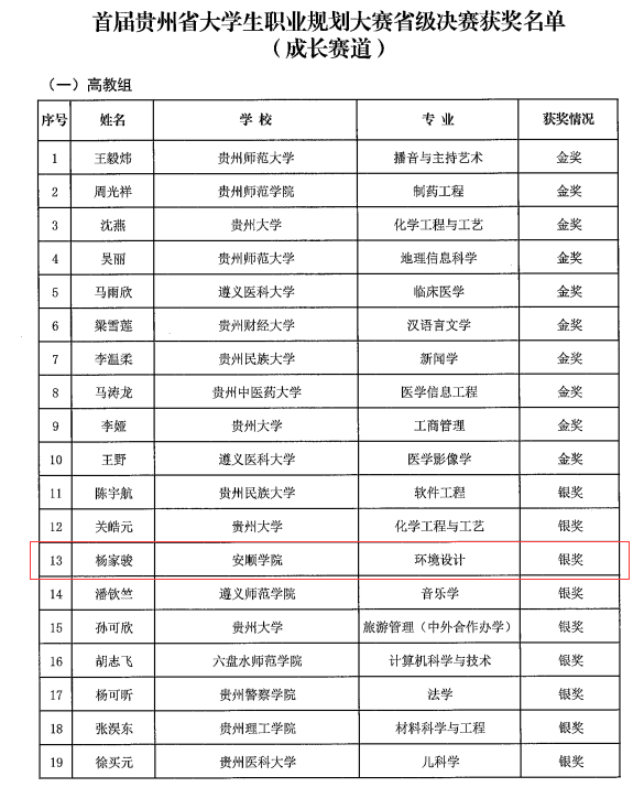 3月14日,首届贵州省大学生职业规划大赛省级决赛在贵州师范大学落下帷幕。3月28日,省教育厅正式公布大赛结果,安顺学院在此次大赛中获得多个奖项,其中艺术学院2021级环境设计专业学生杨家骏获成长赛道高教组银奖,人文学院2021级历史学专业学生杨明才获就业赛道高教组优秀奖,张秋老师团队获教学赛道优秀奖。
