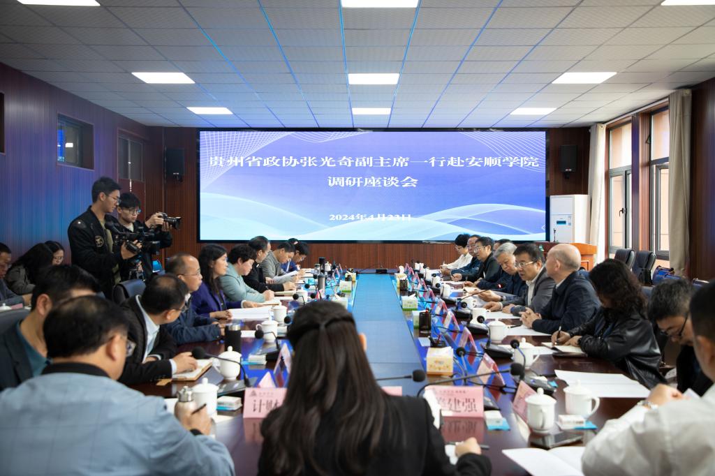 4月23日,全国政协常委、贵州省政协副主席张光奇一行到安顺学院调研指导工作,省政协教科卫体委主任张汉林、省政协教科卫体委专职副主任尤云龙、省政协教科卫体委员会副主任刘雷、省政协教科卫体委副主任王晓林,省政协教科卫体委员会副主任、民进贵州省委副主委、贵阳职业技术学院副院长兰珩等参加调研。安顺市政协副主席、老年大学校长刘敏,市政协宣教文卫体委主任罗玉康陪同调研。安顺学院党委书记罗荣彬、校长曾丽及相关职能部门负责人陪同调研并作介绍。