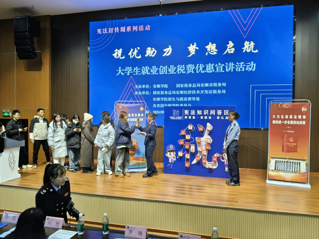 此次活动由国家税务总局安顺经开区分局、安顺学院招就处、校团委共同承办。其目的是贯彻落实党中央、国务院关于高校毕业生创业就业工作会议精神,提升我校大学生对税收优惠政策的知晓度和利用率,助力大学生就业创业。(文/图:招就处    滕飞龙/校团委   刘欢欢)